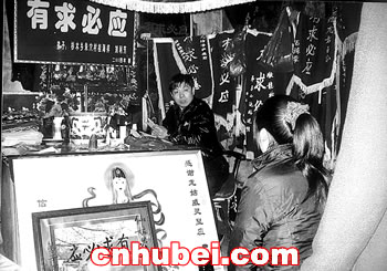 一会,“龙爷”来了,他穿着皮服,手戴大戒指,打着哈欠,一脸疲惫。听说我们专程从武汉而来,他用难懂的黄梅话说:“前几天,‘龙姑’才被武汉的大老板请去过,后来又请到十堰市,这几天又请到江西去了。”他介绍说:“一般初一、十五的人多,星期六、星期天的人也不少,还有一些大干部乘轿车来算命,算财运,算官运,当然,他们对一般人是隐瞒身份的。”