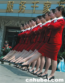 昨日清晨7时,从北京西站驶来的T38次列车驶抵白云黄鹤之地(图一)。这列火车有着不同于平时的“特殊身份”——它系试车的提速新车。4月17日晚,它将更名为Z38次直达特快列车,由武昌站首发北京西。随后,记者在武汉客运段见到了首次着装亮相的Z38次乘务员(图二)。这群平均年龄20岁的漂亮姑娘,身着温馨的红色套装,让人不觉眼前一亮。