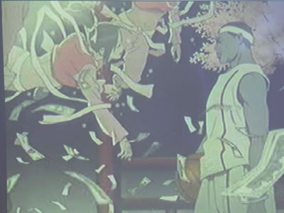 第二个场景:詹姆斯来到二层。这里到处飘着美钞和身穿中国服饰的妇女。漂浮的女子与敦煌壁画中的飞天造型极其相似。这些女子暧昧地向主人公展开双臂。不过,随着詹姆斯扣碎了篮板,“飞天形象”随之粉碎。