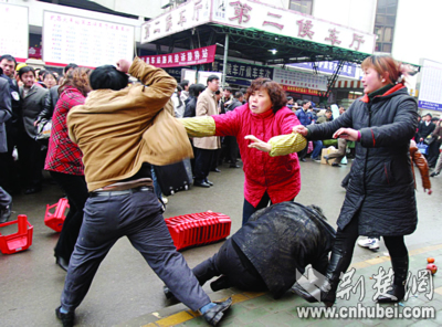 荆楚网(楚天金报)昨日下午4时35分,武昌火车站第二候车厅对面,三名旅客购物时和附近的小卖铺人员发生争执,结果遭到几名身份不明的男子围攻(如左图)。保安闻讯赶来制止。