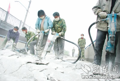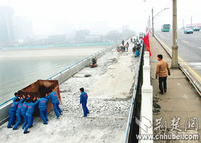 当日上午,记者在现场看到,江汉一桥上游方向的人行道首先封闭施工,另一条人行道和机动车道畅通无阻。数十台机器正在铲除路面的混凝土。
