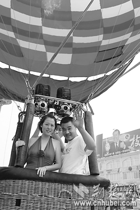 当日上午10时30分,热气球顺利升空,鼓鼓的球囊上挂着“新婚幸福”的大红横幅。在亲友的簇拥下,新郎把新娘抱进吊篮里。热气推动气球缓缓升空。在30多米高空,这对新人频频挥手向亲友和观众致意,两人亲热甜蜜的样子,令大家羡慕不已。