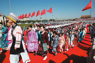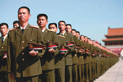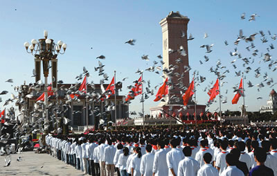 9月3日,中国人民抗日战争暨世界反法西斯战争胜利60周年大型纪念活动在北京隆重举行。上午9时,各界代表向纪念碑敬献花篮。