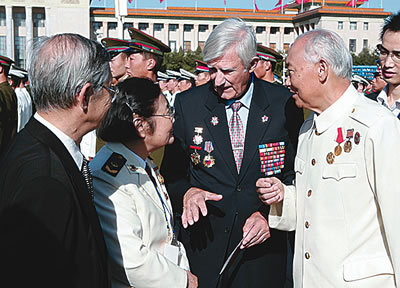 9月3日上午,参加在天安门广场举行向人民英雄纪念碑敬献花篮仪式活动的(由左至右)佟兵(佟麟阁的儿子)、冯理达(冯玉祥的女儿)、舒德洛·达拉斯(俄罗斯老兵)、史同德(老兵),在仪式开始前交谈。