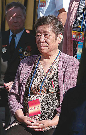 99月3日上午,杨虎城之女杨拯英在天安门广场参加向人民英雄纪念碑敬献花篮仪式。