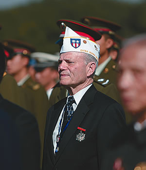 9月3日上午,“飞虎队”老战士格里斯特在天安门广场举行的向人民英雄纪念碑敬献花篮仪式上。
