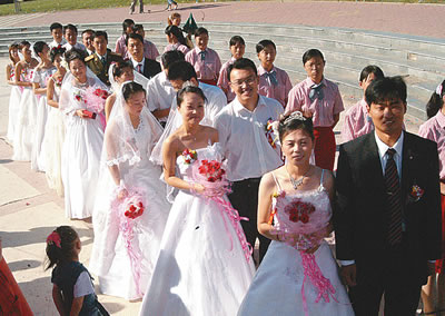 9月3日,新人们手挽手准备步入婚礼的殿堂。当天是抗战胜利纪念日,山东烟台市福山区9对青年参加以“纪念抗战胜利60周年”为主题的集体婚礼,共同企盼世界和平。