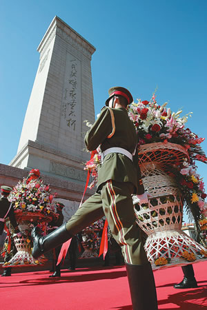 今天的北京,秋高气爽,晴空万里。天安门广场松柏苍翠,红旗招展。广场中央的人民英雄纪念碑巍峨耸立,“人民英雄永垂不朽”8个镏金大字熠熠生辉。在纪念碑两侧用松柏组成的幕墙上,镶嵌着“牢记历史、不忘过去、珍爱和平、开创未来”的醒目标语。纪念碑前,18名陆海空三军礼兵持枪肃立。