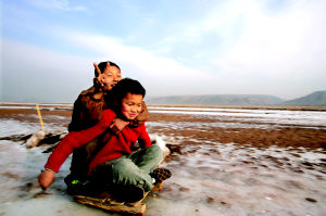 榆林府谷经历了6年的干旱,2004年冬季的降水比较充足,黄甫川的河水结冰了,成了孩子们冬天的乐园