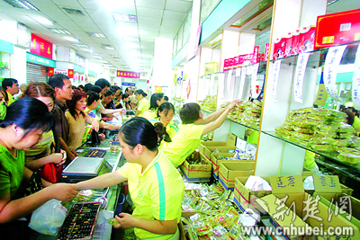 荆楚网(楚天都市报)(记者潘勤 摄影:记者杨峰洲)昨日是中秋节前的最后一天,又逢周六,月饼市场迎来最后的热闹,销售红火,相对于动辄上百元一盒的豪华装月饼而言,江城市民更青睐价格便宜的散装、简装月饼。记者昨日在武昌司门口的一家食品店看到,这里的散装月饼柜台被围得水泄不通,大家争相购买,营业员忙得不亦乐乎。