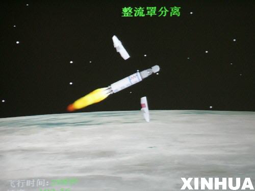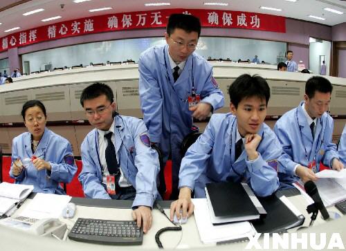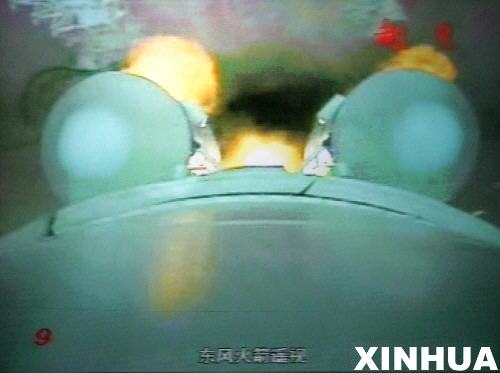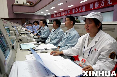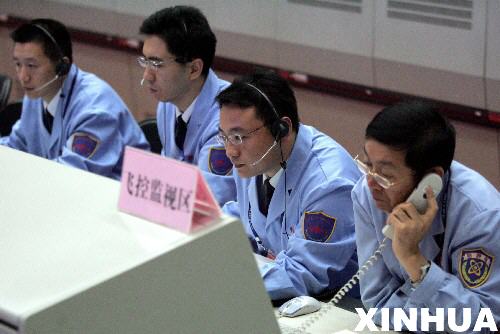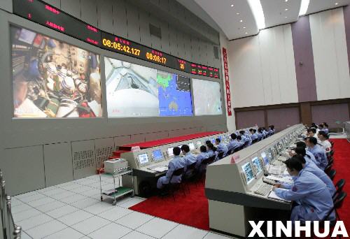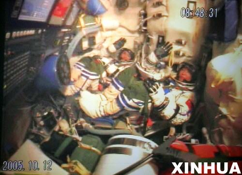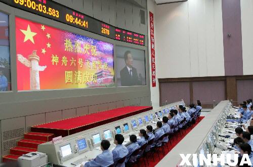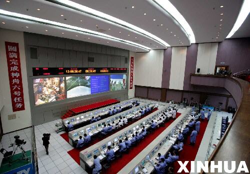 北京航天飞行控制中心的电视屏幕正在播出航天员起飞前向大家挥手致意的画面(10月12日摄)。 新华社记者 查春明 摄
