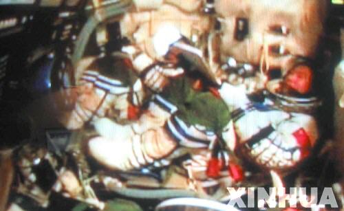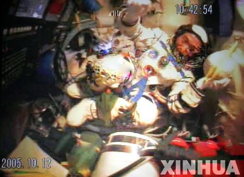 北京航天飞行控制中心电视屏幕播出的航天员费俊龙在飞船内工作的画面(10月12日摄)。新华社记者 查春明 摄