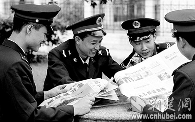 昨日,广州军区驻汉通信总站官兵在交流神舟六号载人飞船顺利升空的报道,并在官兵中掀起了学习航天精神的热潮。