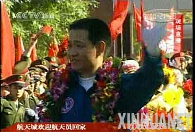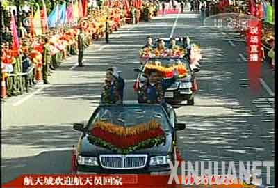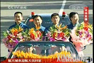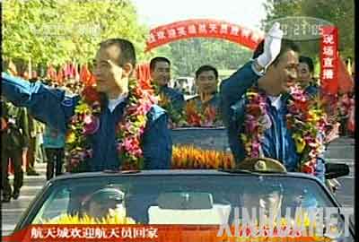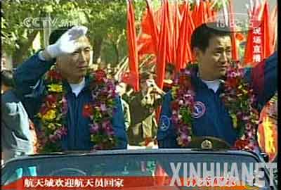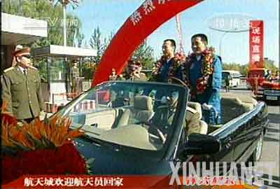新华网神六快讯:10时17分,两位航天员抵达航天城。一时间,欢迎的人群沸腾了,欢呼声、锣鼓声、乐曲声,响彻云天。