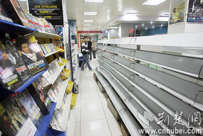 昨日,省及武汉市文化部门出动百余名稽查人员,对市内各大音像制品卖点进行突查。从110家音像门店中,挖出6个地下黑窝点,收缴盗版音像制品近20万张。图为位于武昌珞狮南路附近的“力神电器”听到风声,忙将盗版音像制品从柜台上撤下。执法人员还是从阁楼上查出了隐藏的5000余盘盗版碟。