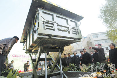 在武昌梨园路湖北财经专科学院内,记者看到了这座新型垃圾站———占地仅14平方米,垃圾站顶部与地面齐平,垃圾从翻板式的入口进入垃圾箱,同时被压缩密封;需要清运时,垃圾车司机按动遥控器,整个垃圾站就可从地下升起(如图),垃圾箱最前端的挡板自动打开,压缩系统就能把垃圾直接推进垃圾运转车内,整个过程仅10余分钟。