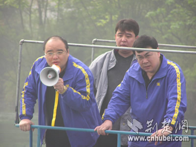 在训练的现场,张健始终在伴随船上认真参看队员的动作,并不时提醒队员。此次挑战赛的总裁判――国际队裁判周玉成乘坐求援船,一直跟随着队员,观察他们的状态,偶尔也向队员提出要求,要他们注意前进的方向和速度的控制。伴随船、求援船和导航船,救护人员、医护人员也参加了这次演练。