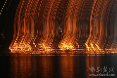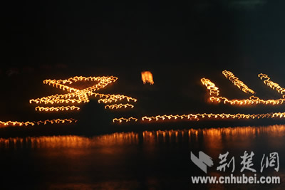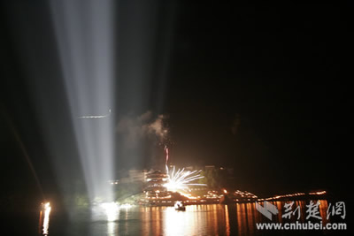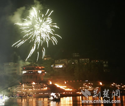 据悉,钟离山是长阳巴土人的发源地。在魏刚离上岸1000米时,船上响起助威加油的呐喊声,对岸钟离山上燃起熊 熊篝火,500支油筒火映红清江水,组成“巴山圣山”四个金色大字,同时,夜空中五彩焰火满天,迎接纵渡勇士。