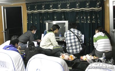 凌晨1点多,记者们有的吃着方便面,有的靠在座椅上小憩,没座位的人拉起睡袋躺在地上。舱内大大小小的飞蛾不时停在记者们的身上,甚至脸上,引起女孩子们的阵阵尖叫。