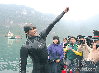 荆楚网(楚天都市报)(记者 钟楠 魏铼 梅晓芸 郑联学)昨日12时19分52秒,第六棒接力队员冯珉从长阳陈家沱清江画廊度假村码头起水,张健横渡队挑战清江成功。