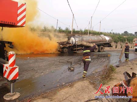 笔者于16时赶到现场时,发生事故的路段已被封锁,来自临汾市消防支队、翼城县公安专职消防队、酒钢企业消防队以及侯马、洪洞消防中队的消防官兵和环保部门工作人员正在全力抢救。事故现场,黄色的浓烟伴随着刺鼻的气味不断向外扩散,交警忙着输散围观的群众。
