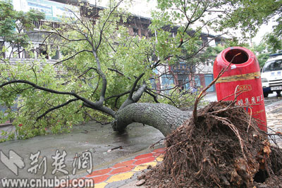 记者立即向葛洲坝城管部门反映,几分钟后,葛洲坝园林工程部的工作人员赶到现场,经检查,该树已经没有抢救价值,随即进行清除。据他们介绍,这是一棵已有21年的香樟树,直径达0.2米,树根已经腐朽,可能是缺少营养所致。