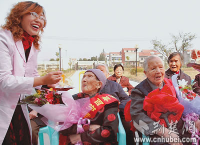 “活了100多岁,我还没过过这么热闹的生日!”看着眼前的一切,彭选珍(左二)老人眼里泛起了泪花。14日是彭选珍老人101岁的生日,云梦县老龄委和民政局专门到县福利院举行了一场特殊的庆典,祝愿老人幸福长寿。该福利院目前生活着5位百岁老人,逢节日或生日,政府都会派人登门慰问,并邀请其亲友与老人们团聚,共享人生幸福时光。(记者王威 通讯员王云清摄)