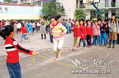 昨日上午,武昌梨园小学广播体操时间里,同学们纷纷开始跳绳。正跳、反跳、单摇、双摇、八字跳、集体跳……个个跳得乐不可支。