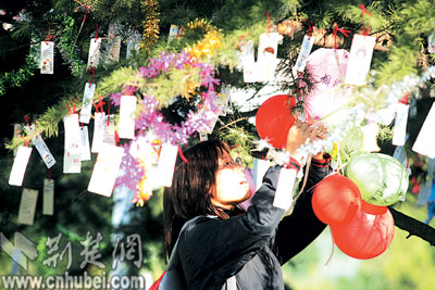 昨日,在中南财经政法大学南湖校区的体育馆旁,一棵挂满小卡片的松树,就像一棵圣诞树,吸引了许多学生观看。卡片上面,都是学生写的祝福和愿望,如“我祝愿爸爸妈妈平安健康”、“我希望期末考试能考好”等。(记者王灿 杨峰洲 摄)