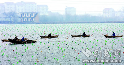 昨日上午,洪山乡渔光村附近东湖上,数只木船穿梭来往,船工们将一只只色彩鲜艳的塑料瓶串在一起,在湖面编织着一张巨大的网。原来,这是工人们在养珍珠。