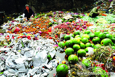 昨日,记者在汉口华南果批市场看到,西瓜、青枣、芦柑等水果在垃圾站堆成了山。