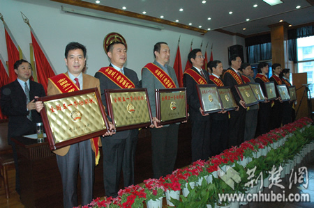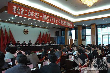 省总工会副主席何忠琦宣读了全国总工会和湖北省总工会关于颁发全国和湖北五一劳动奖状、五一劳动奖章的决定。武汉第二电线电缆有限公司等13个先进集体和常雨琴等48名先进个人分别荣获2007年全国五一劳动奖状、奖章;湖北稻花香集团等49个先进集体和刘继平等100名先进个人分别荣获2007年湖北五一劳动奖状、奖章。