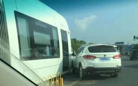 2个月后,又双叒撞了!这次是江夏流芳园横路站附近,一辆光谷有轨电车与一辆白色私家车撞上了。