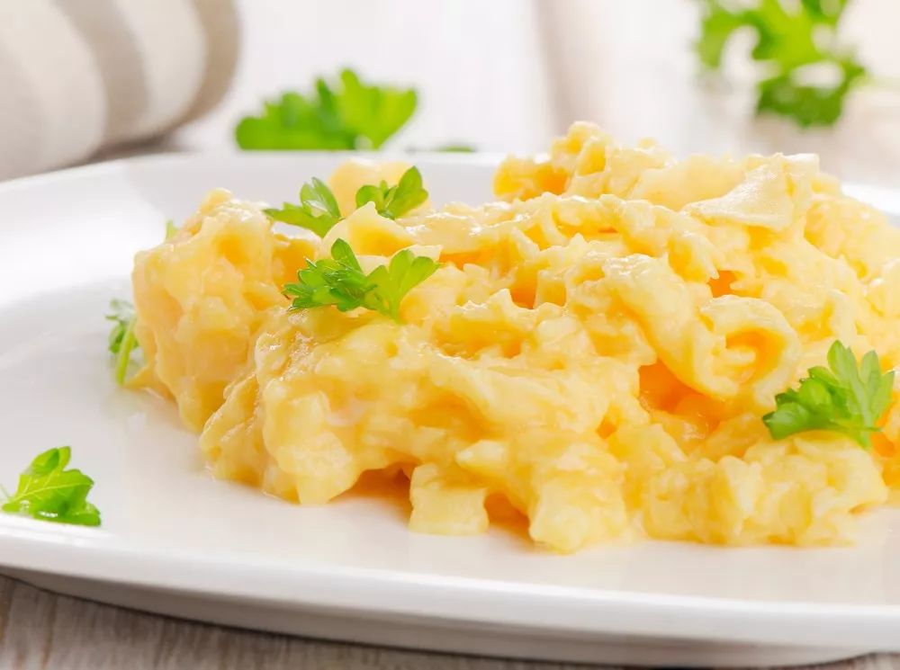 油五分热时就加入蛋液,用中低火不断翻搅,快熟时关火,利用余温让其熟透。