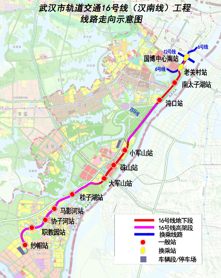 武汉地铁16号线全长33.1公里,南起周家河站,北至国博中心,设站12座,是一条连接汉南、军山与中心城区的快速轨道交通线路。截至目前,除国博中心南站以外,其余车站主体结构均已完工;16个单线隧道全部贯通;高架区间共8个,6个正在施工,2个已贯通;全线铺轨单线75公里,目前已完成铺轨约32公里。