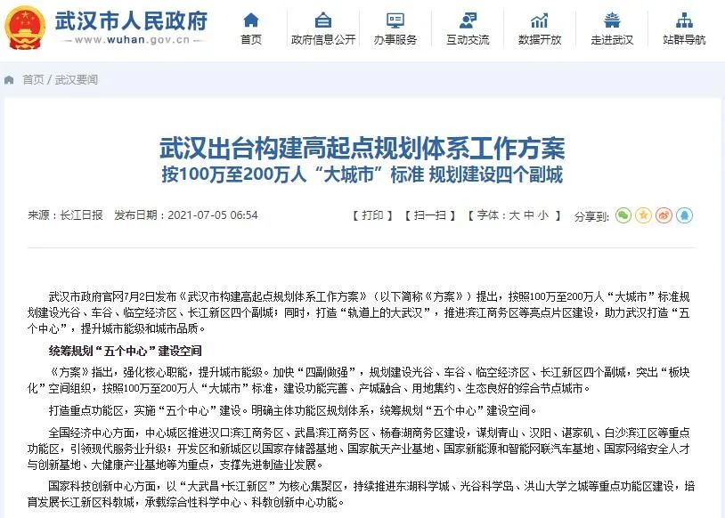 武汉市政府官网近日发布《武汉市构建高起点规划体系工作方案》(以下简称《方案》)提出,按照100万至200万人“大城市”标准规划建设光谷、车谷、临空经济区、长江新区四个副城;同时,打造“轨道上的大武汉”,推进滨江商务区等亮点片区建设,助力武汉打造“五个中心”,提升城市能级和城市品质。