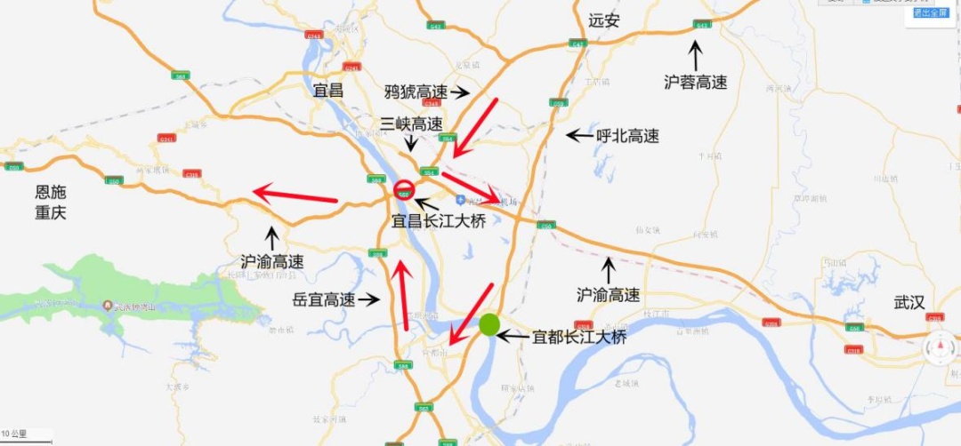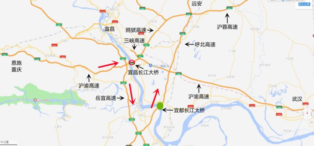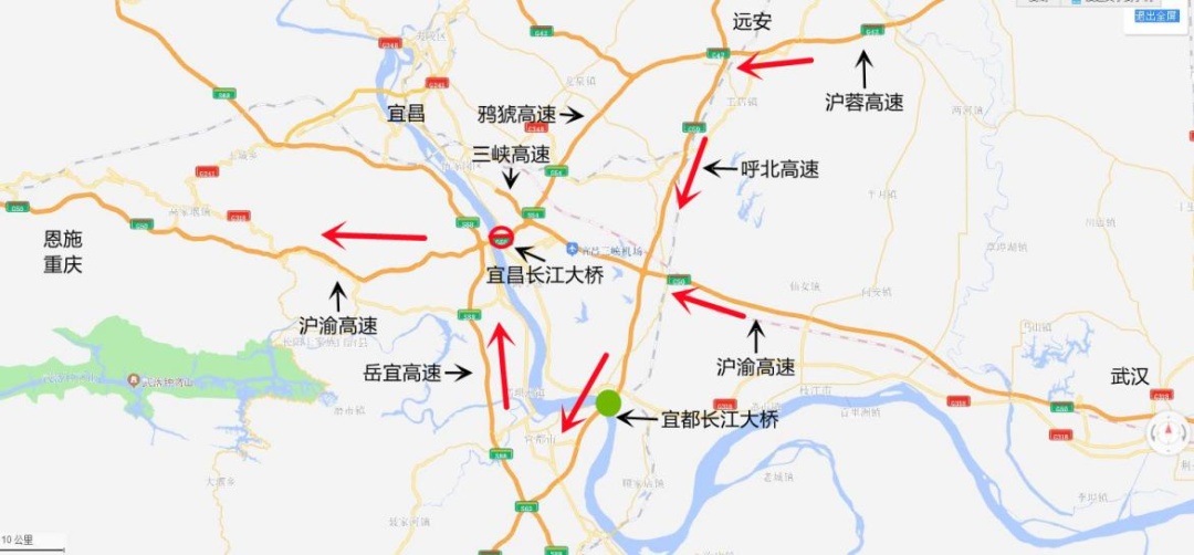 2、G42沪蓉高速(恩施方向)、G50沪渝高速(恩施、重庆方向)过江车辆绕行G59呼北高速宜都长江大桥—S88岳宜高速—G50沪渝高速至重庆。