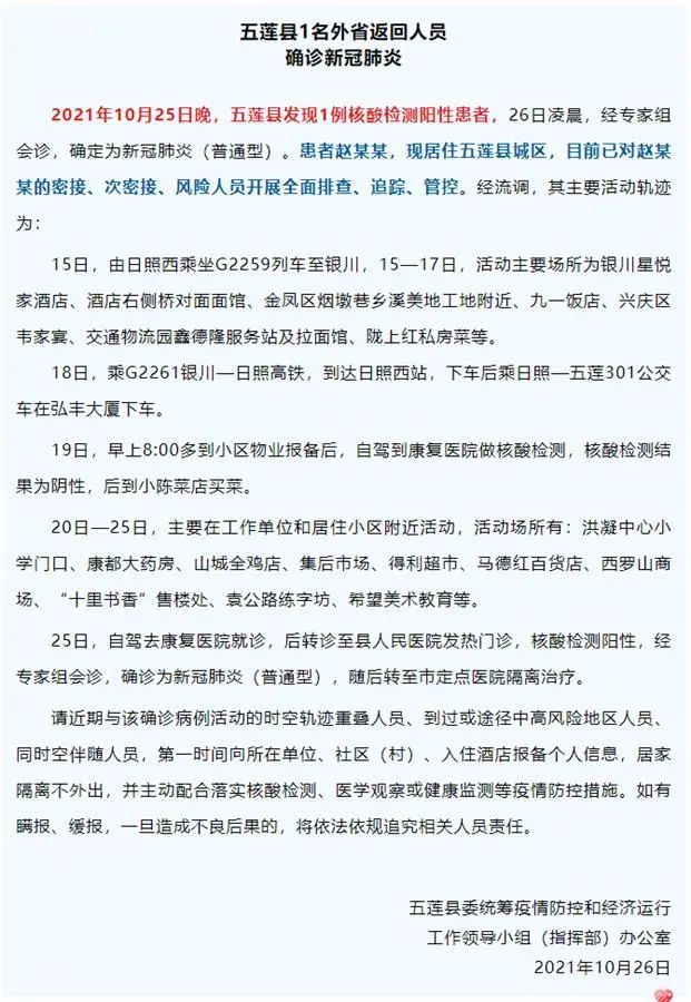 10月25日晚,日照市五莲县发现1例核酸检测阳性患者,26日凌晨经专家组会诊,确定为新冠肺炎(普通型)。