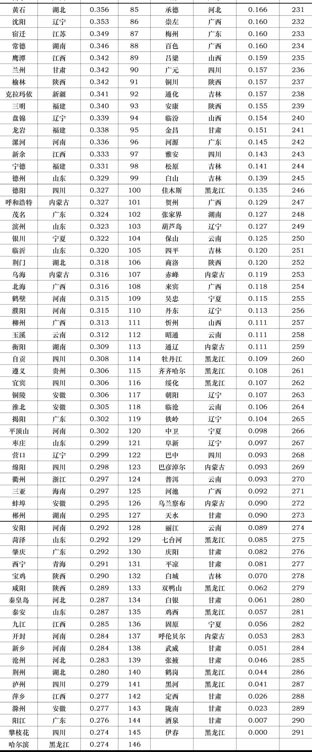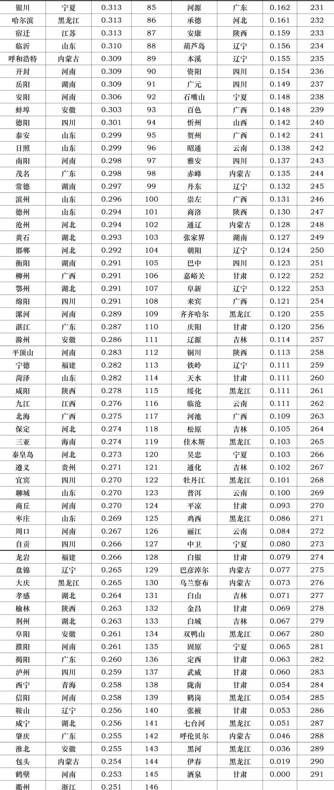 2021年中国291个城市的