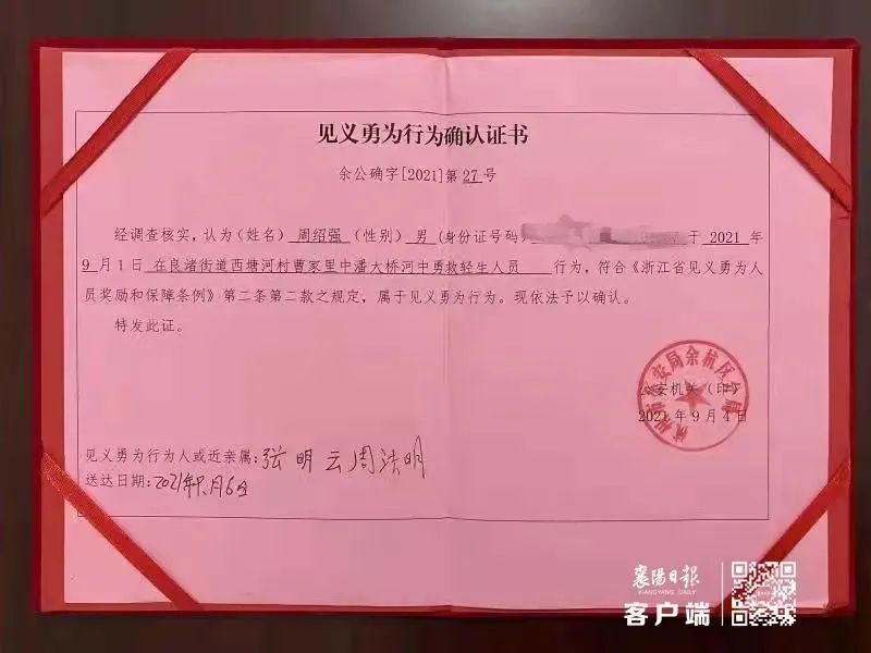 杭州市公安局余杭区分局认定周绍强的行为系见义勇为,相关部门向他的亲属颁发了他见义勇为的荣誉证书,并申请了见义勇为基金。