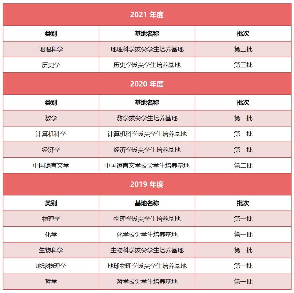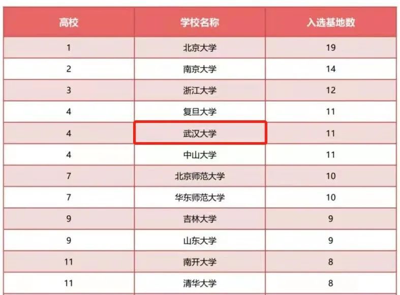 此前公布的两批基础学科拔尖学生培养计划2.0基地名单中,武汉大学已有物理学、化学、生物科学、地球物理学、哲学、数学、计算机科学、经济学和中国语言文学9个拔尖学生培养基地。至此,武汉大学共有11个基础学科拔尖学生培养计划2.0基地,总数位列全国第四。