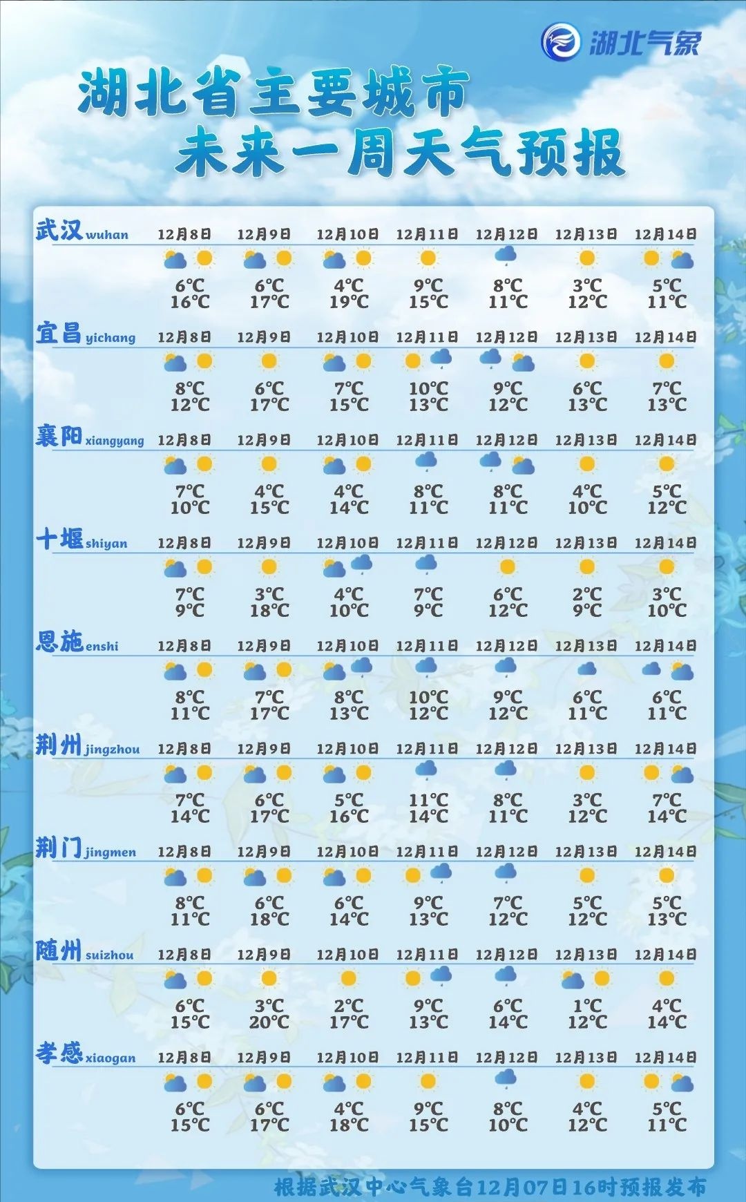 最低气温:鄂西北1~4℃;其他地区5~8℃