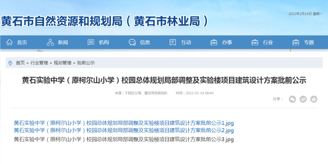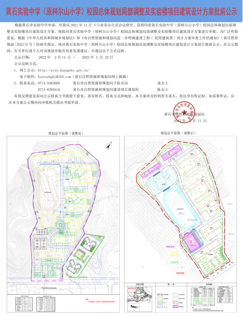 为广泛听取意见,根据《中华人民共和国城乡规划法》和《市自然资源和规划局关于进一步明确建设工程(民用建筑类)设计方案审查工作的通知》(黄自然资规函[2021]8号)的相关规定,现对黄石实验中学(原柯尔山小学)校园总体规划局部调整及实验楼项目建筑设计方案进行批前公示。在公示期间,有关单位或个人对该规划审批有何意见或建议,可通过以下方式反映。