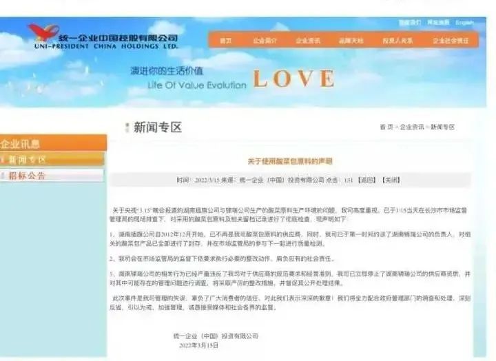统一(中国)投资有限公司当晚在官网发布声明回应称,公司高度重视,已于3月15日当天在长沙市市场监督管理局的现场排查下,对采用的酸菜包原料及相关留档记录进行了彻底检查。统一发布声明表示,湖南插旗公司自2012年12月开始,已不再是该公司酸菜包原料的供应商,同时,统一已于第一时间约谈了湖南锦瑞公司的负责人,对相关的酸菜包产品已全部进行了封存,并在市场监管局的参与下一起进行质量检测。