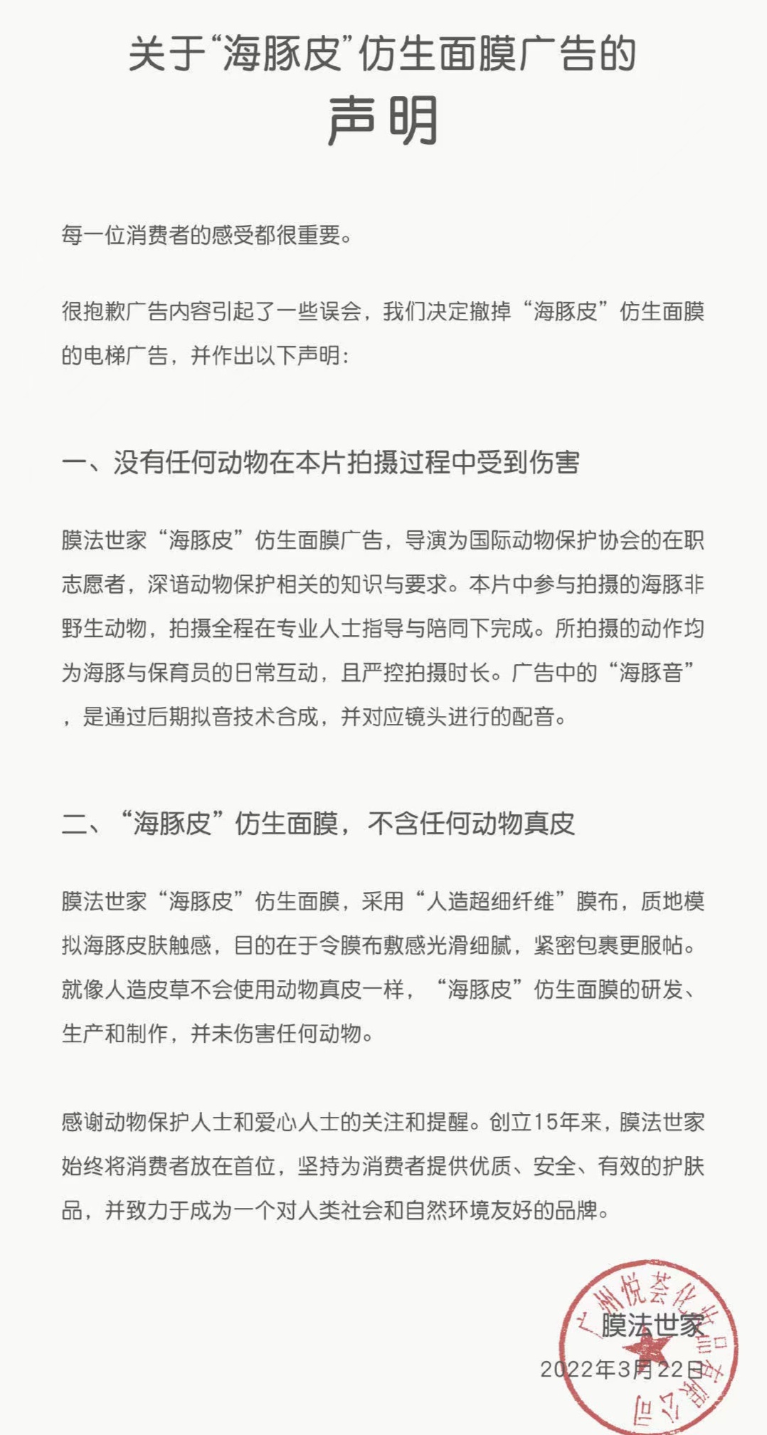 3月22日23时,膜法世家紧急发布声明称:“我们决定撤掉‘海豚皮’仿生面膜的电梯广告。”声明中介绍,该广告导演为国际动物保护协会的在职志愿者,深谙动物保护相关的知识和要求。广告所拍摄的动作均为海豚和保育员的日常互动,且严控拍摄时长。广告中的“海豚音”是通过后期拟音技术合成,并对应镜头进行的配音。