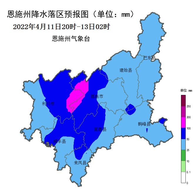 根据最新气象资料分析,今晚到明天我州自西向东有一次大范围较强降雨过程,大部大到暴雨,局部大暴雨。预计过程累积雨量一般在40~60毫米,局部100毫米以上,最大小时雨强30~50毫米。此轮降水过程对流性特征明显,大部伴随雷电,局部有冰雹大风和短时强降雨。降水空间分布不均,强降水中心主要位于利川、恩施、宣恩、咸丰北部(具体见附图)。