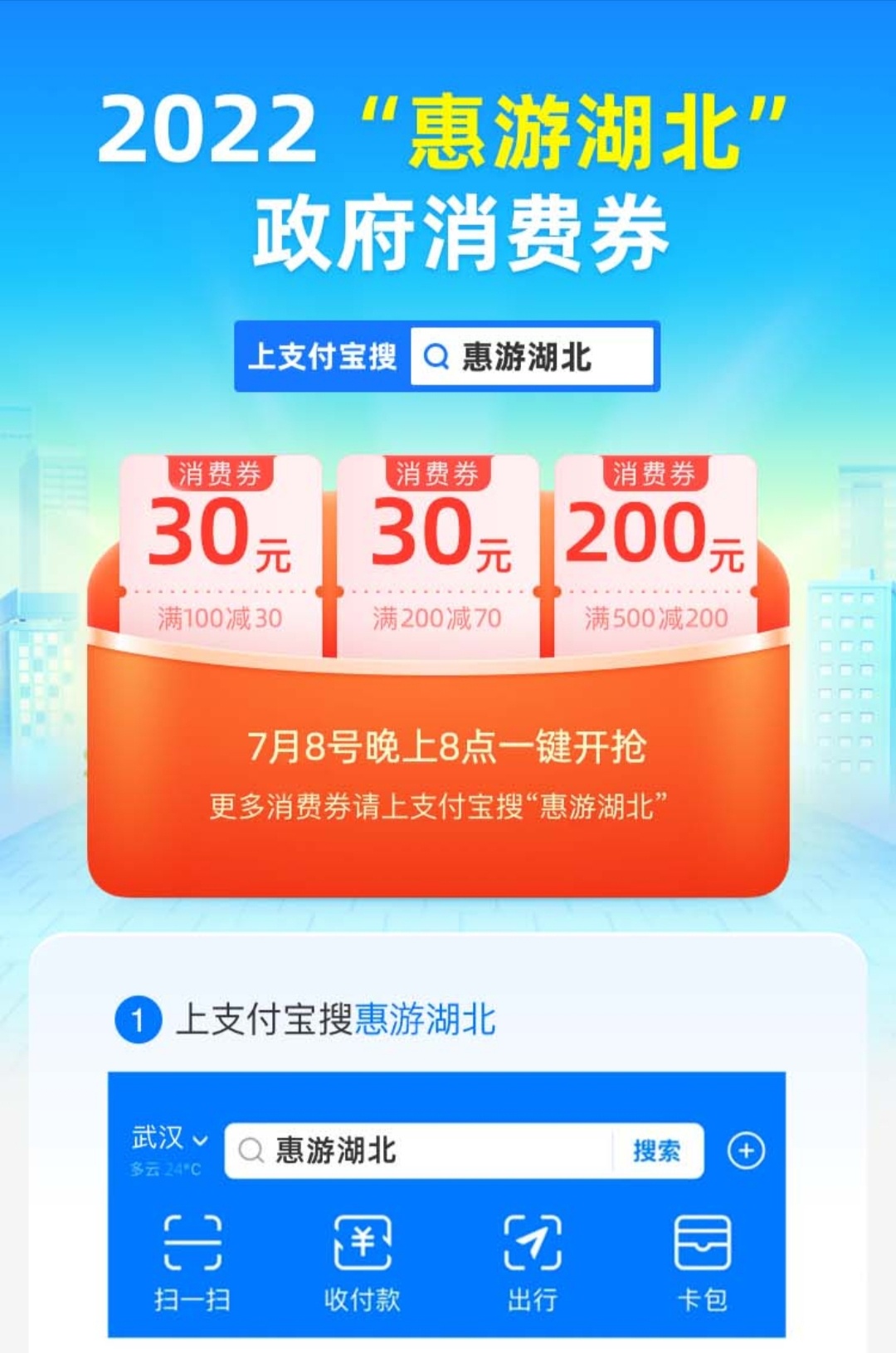 活动期间,符合活动参与条件的用户可在手机打开支付宝APP,点击支付宝首页氛围图或搜索“惠游湖北”,即可进入“惠游湖北”活动会场,会场页面上有三种品类不同面额共计11种消费券,具体面额如图。