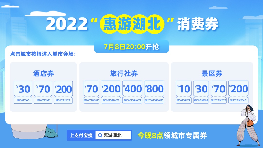 以“欢乐暑假”为主题的2022“惠游湖北”消费券第二阶段将于7月8日20:00正式投放,多条精品避暑纳凉休闲度假线路及星级酒店、A级景区、特色民宿、文化演艺产品实行20-40%的优惠政策。