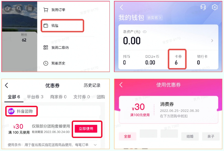 进入抖音APP-点右下角“我”-三道杠-钱包,点击“卡券”,点击“团购优惠券”进行使用,选择带有“惠游湖北”标签的商家套餐进行下单。