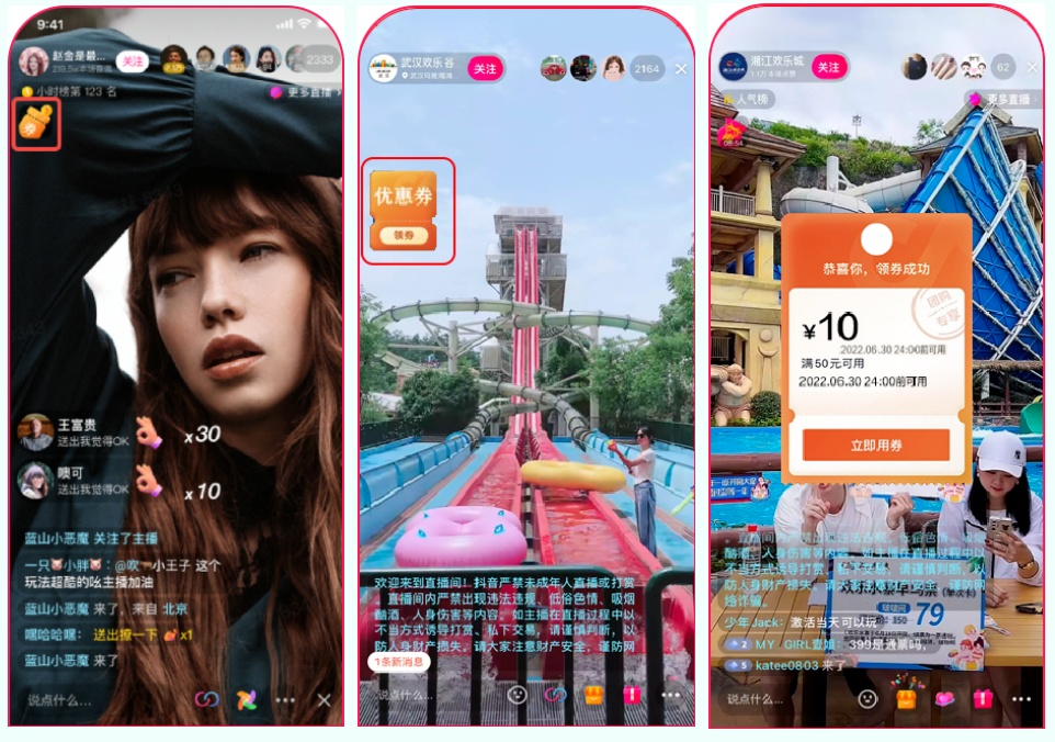 (三)直播间:打开抖音进入“2022惠游湖北”直播间,点击直播间福袋、优惠券等发券标志进行消费券抢领;领取消费券后,点击直播间小房子按钮进行商品选购和下单,直接使用消费券。